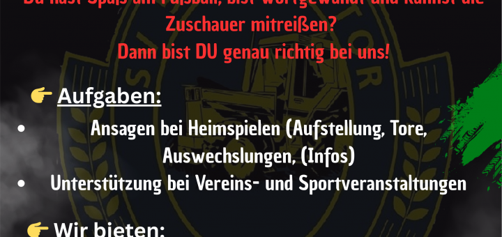 Wir suchen dich, werde Stadionsprecher und gebe deine Stimme unseren Verein !!! Unser Verein sucht eine motivierte Stimme für unsere Heimspiele! Du hast Spaß am Fußball, bist wortgewandt und kannst die...